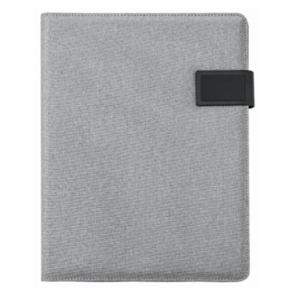 Mit mattschwarzer Metallplakette und moderner Aufteilung für technische Accessoires. Mit Magnetverschluss, Tablet- und Stiftehalter, Block und vielen Fächern.