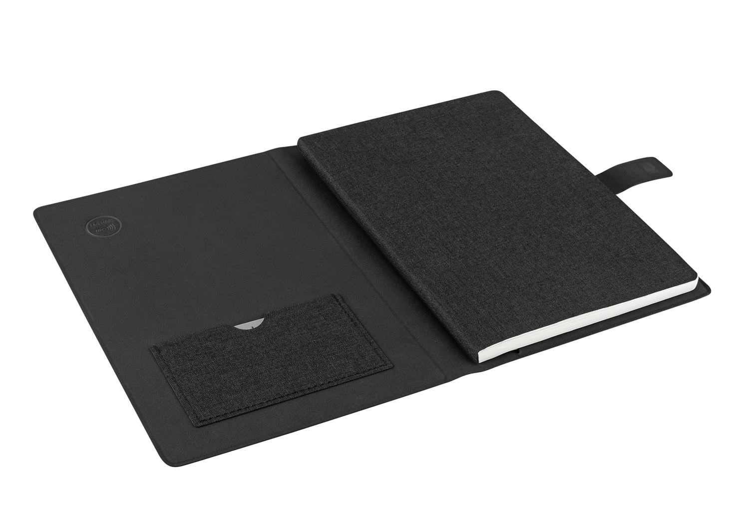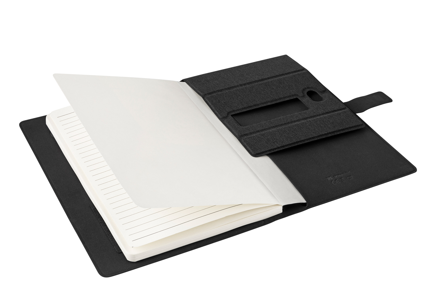 Digital meets Classic – NFC Business & Travel Mobile Office Notebook (aus recycelten PET Flaschen) mit praktischem aufstellbarem Handy/Touchpenorganizer, A5 Schreibblock (50 Seiten, austauschbar), digital: auf dem integrierten NFC Chip kann Ihre individuelle Webseite sofort aufrufbar für den Kunden hinterlegt werden, mit edler Magnetschließe.
