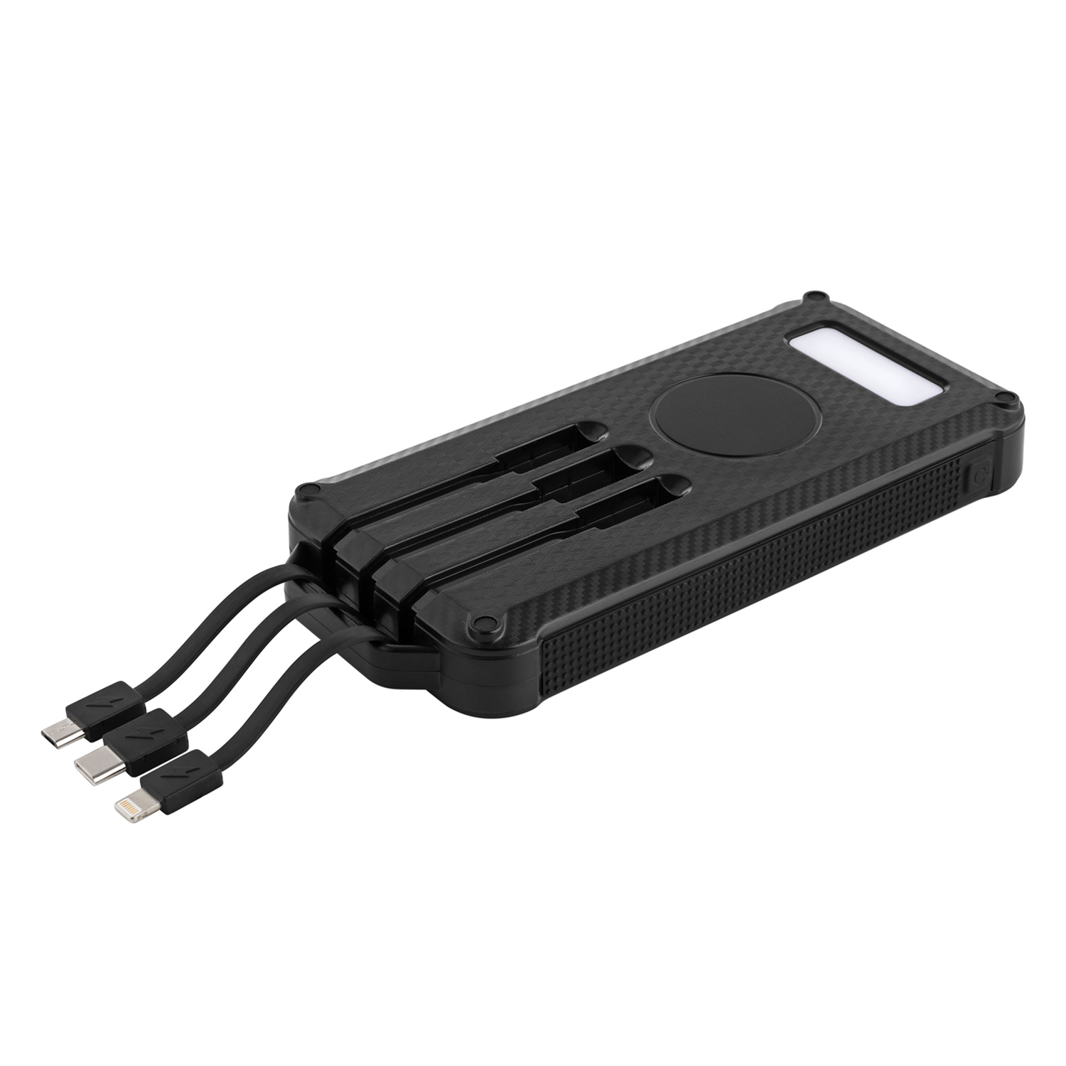 Ressourcen- und umweltschonendes Gehäuse aus recyceltem ABS & mit Recycling PET ummanteltes Kabel - für Ihre Unabhängigkeit: großes Solarfeld (bis zu 1,2 Watt, 300 mA/h) pflegt/lädt den Akku mit jedem Lichtstrahl der eingefangen wird (auch konventionell aufladbar). Integrierte Ladekabel auf der Rückseite (Micro- USB, USB-C & Lightning®) und High-Tech Induktions-Ladefeld für kabelloses Laden 10 Watt. Mit 2W COB Lampe und Spritzwasserschutz (Ports durch Silikondichtung verschlossen IP5). Inkl. 30 cm USB Kabel.