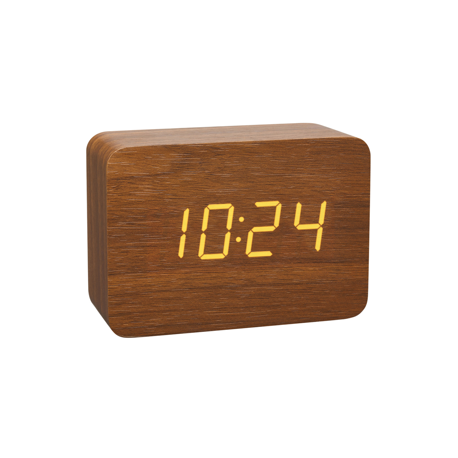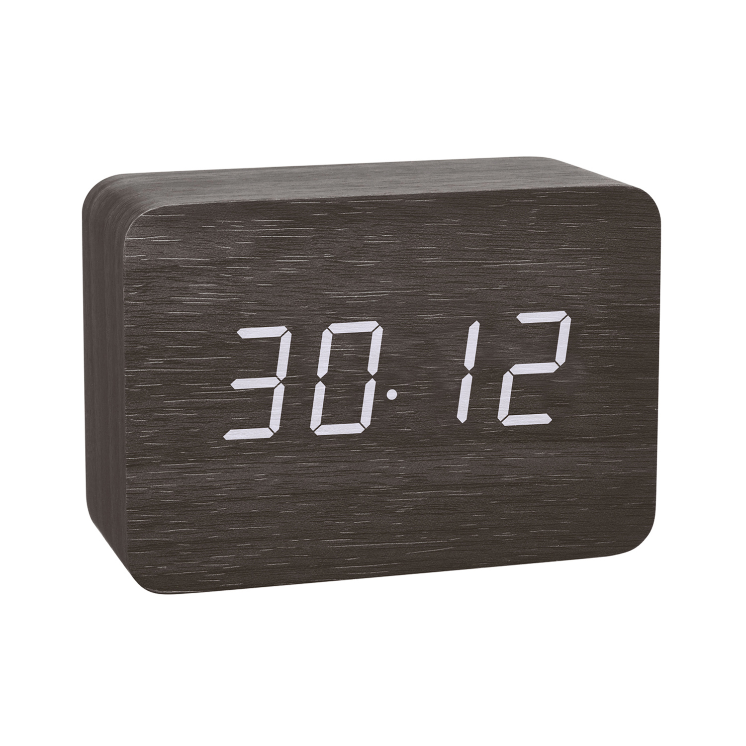 Holz-Optik mit unsichtbarem Display, Anzeige mit 3 Helligkeitsstufen: Uhrzeit, Datum oder Innentemperatur (automatischer Wechsel einstellbar). Weckalarm (Aktivierung durch Berühren oder Geräusch), im Dauerbetrieb mit Netzadapter, Material: Kunststoff. Farben: schwarz, braun. Maße: 10 x 4,1 x 7 cm, Gewicht: 128 g, inkl. Batterien (1 x 3 V CR2032), inkl. Netzadapter.
