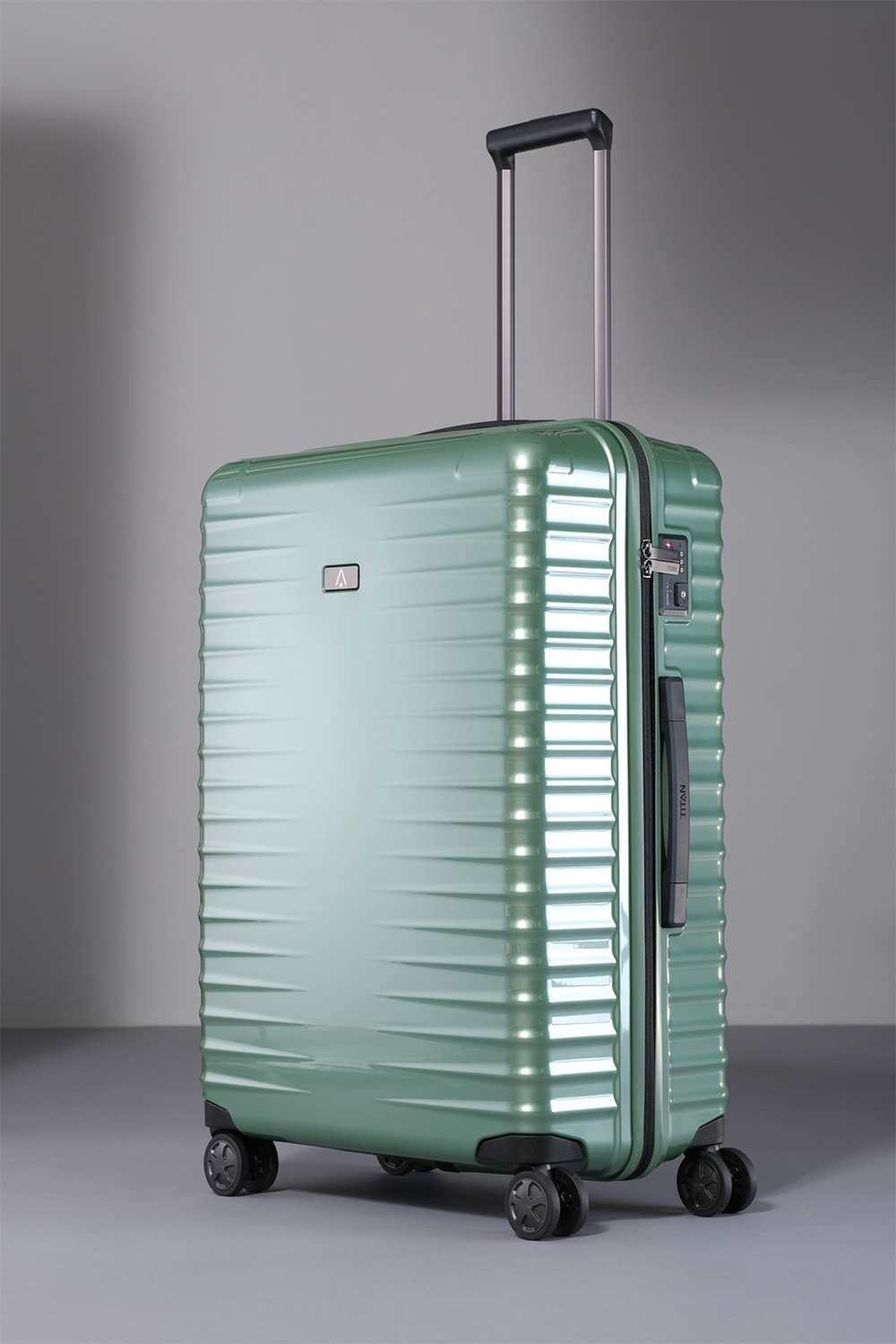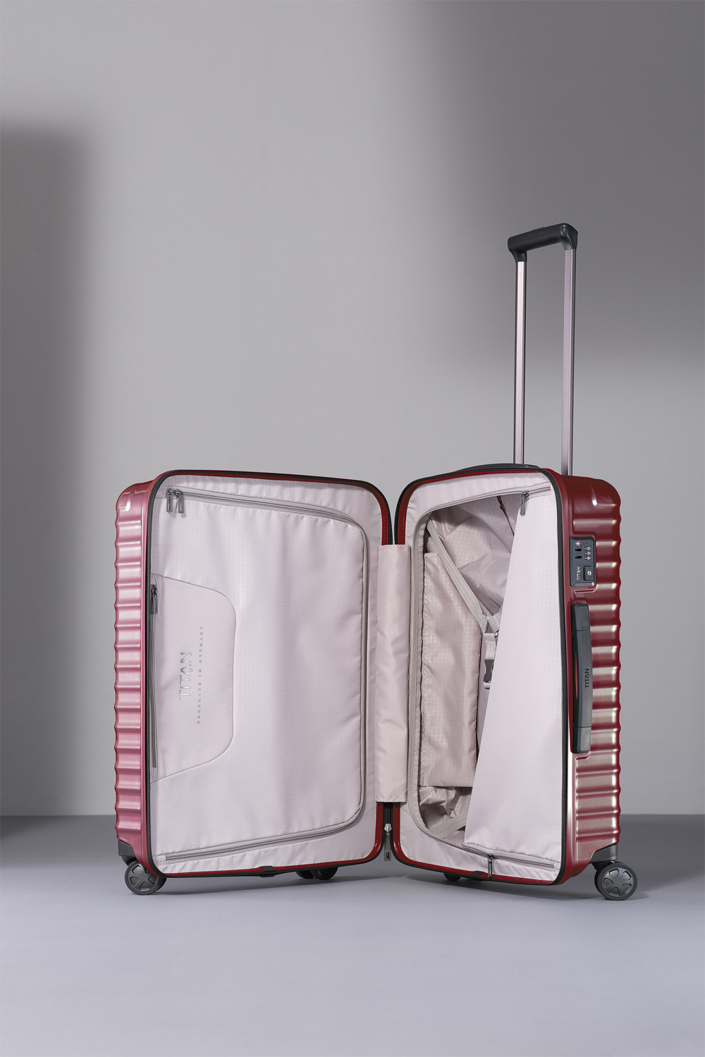 Mit komfortablem Tragegriff. Große, versenkte 6 cm TITAN Doppelrollen – besonders geräuscharm. TSA LOCK® Kombinationsschloss, hochwertiges Innenfutter aus recyceltem Polyester. Markante Schutzecken, zwei Oberflächenstrukturen „Flash“ und „Matt´´. Innen zusätzliche Reißverschlussfächer und Packgurte auf beiden Seiten. In Hamburg designt, im Bayerischen Wald von Hand vollendet.