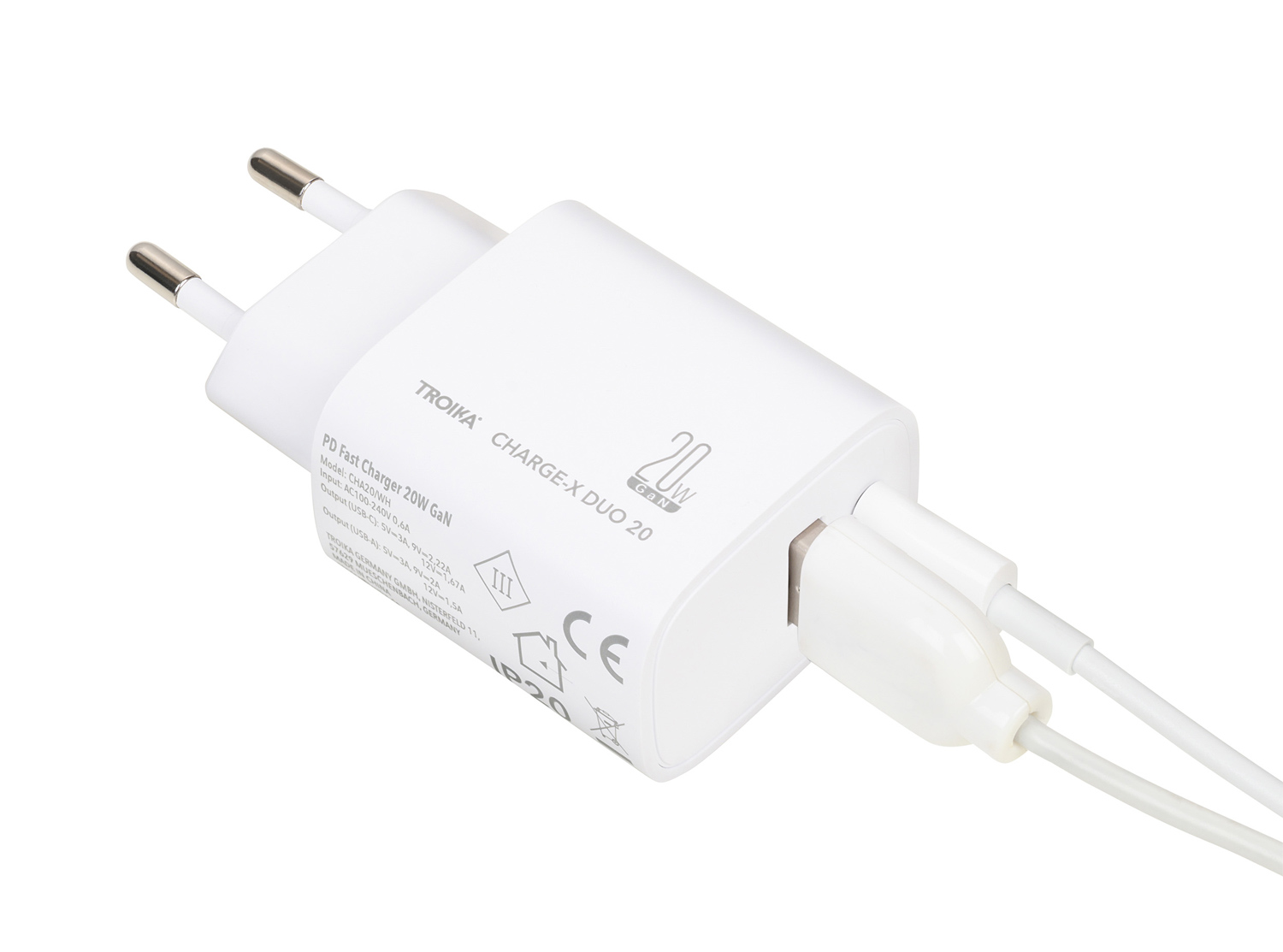 Ladestecker mit GaN - und Schnellladetechnologie Power Delivery, 20W mit USB-C und USB-A Anschluss, zum gleichzeitigen Laden von zwei Geräten.