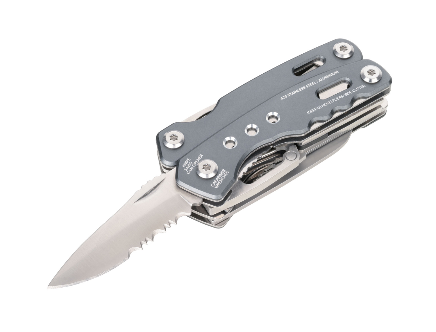 Multifunktions-Werkzeug Rucksack Tool mit 15 Funktionen, integrierte Feder und Feststellfunktion, Spitzzange, Zange, Seitenschneider, Messer, Säge, Schlitzschraubendreher, Dosenöffner, Feile, Karabiner, Flaschenöffner, Sechskant-Schraubenschlüssel, Werkzeuge im eingeklappten Zustand außenliegend, in Nylontasche mit Gürtelschlaufe, 420 Edelstahl, Aluminium, eloxiert, matt.