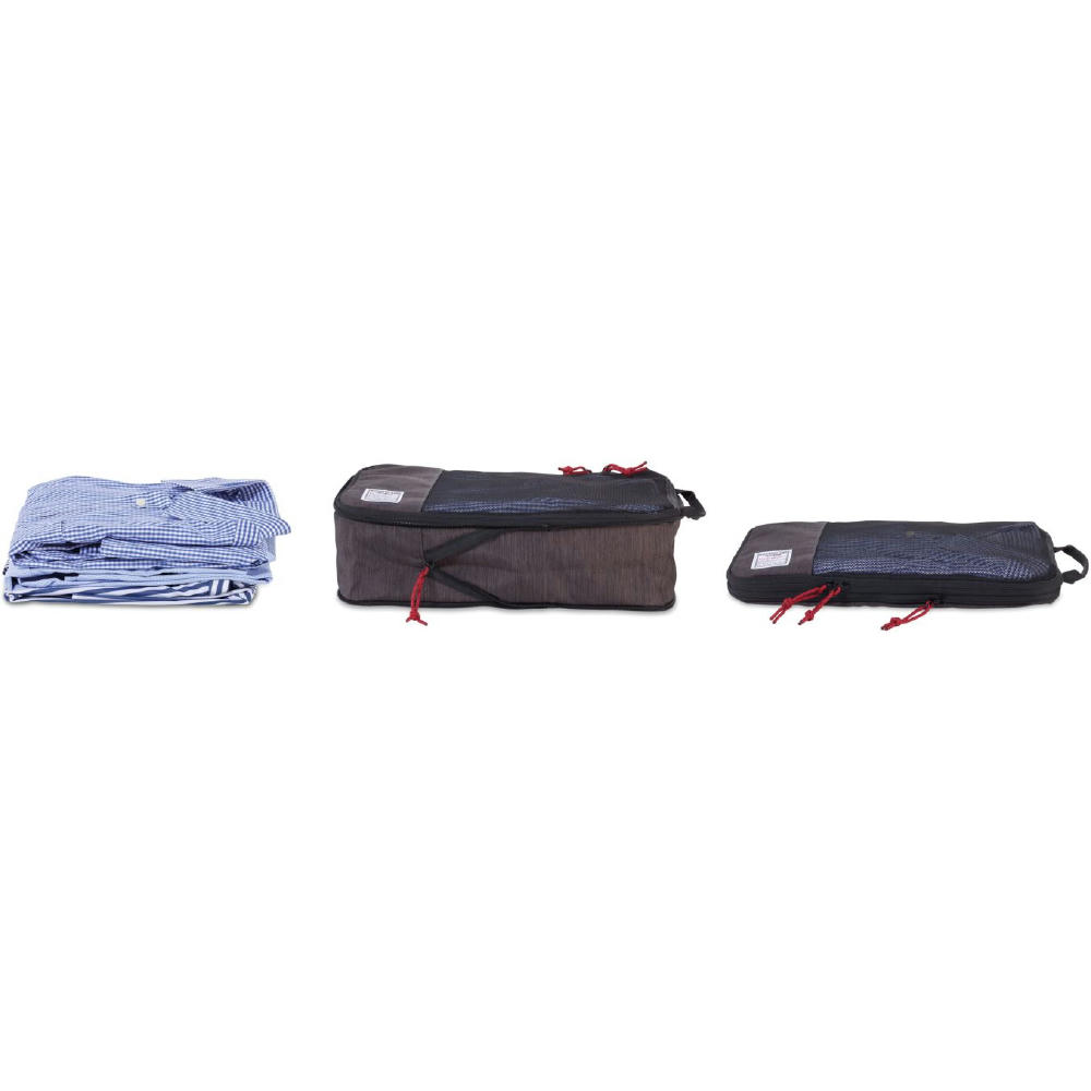 Kompressionstaschen-Set: 3 Packtaschen mit Reißverschluss und zusätzlichem Kompressionsreißverschluss für platzsparendes, geordnetes und knitterfreies Packen von Kleidung in Koffer & Rucksack, 3 Größen: L (Hemden & Hosen), M (Shirts), S (Wäsche & Socken), jeweils mit Netzfenster und Tragegriff. Material: Polyester. Farben: anthrazit, schwarz. Maße: 39 x 27 x 4 x cm, Gewicht: 445 g