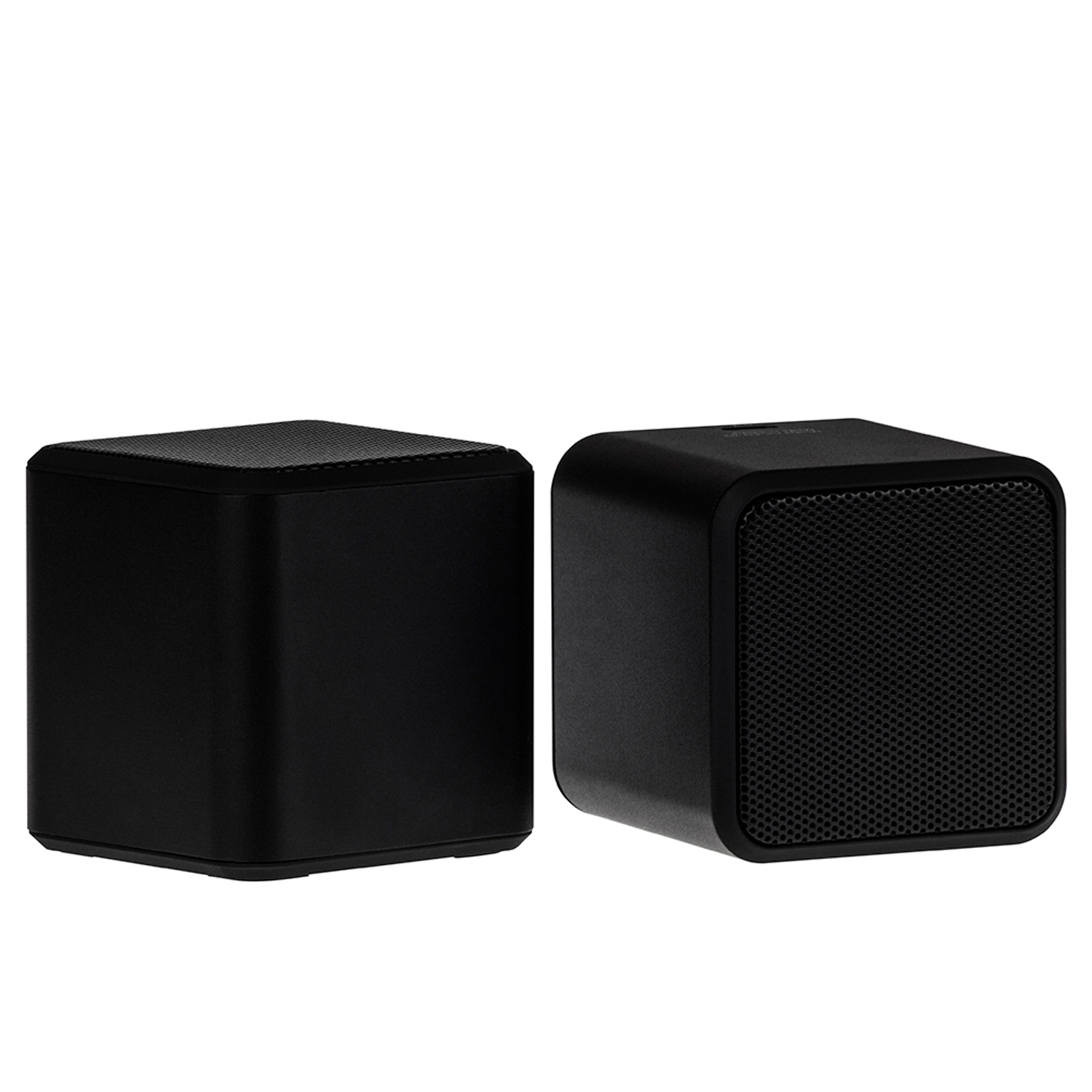 Twinspeaker besteht – wie der Name schon suggeriert – aus zwei unabhängigen, kleinen Lautsprechern, die für satten, kabellosen **2 x 3 Watt** Stereo-Sound sorgen. Egal wo sie sind. Durch die Auto-Stereo Kopplung und zusätzlichen Steuerelementen auf jedem der „Twins“ ist die Bedienung genauso einfach und intuitiv, wie Sie es von einem Bluetooth Speaker gewohnt sind. Freisprechfunktion inklusive. Für einen perfektes, räumliches Klangerlebnis – zum Beispiel bei einem spannenden Blockbuster – richten Sie die beiden kubischen Lautsprecher ganz nach Belieben und unabhängig voneinander aus. Ihr Logo als elegante Gravur oder brillantem Druck auf dem matt-schwarzen Aluminiumgehäuse ist hier gleich doppelt im Sichtfeld ihrer Kunden.
