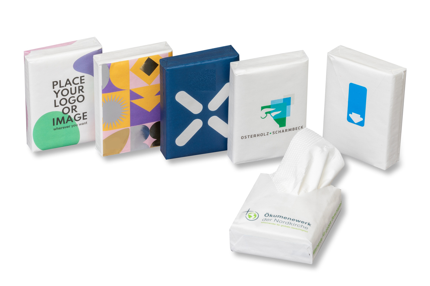 Tücher - 21x21 cm - gefaltet - 4-lagig – soft in Papierverpackung 50 g, keine Kaschierung. Verschlüsse in 5 Standardfarben verfügbar: schwarz, weiß, rot, grün, blau. Grundfarbe weiß individuell zu gestalten.