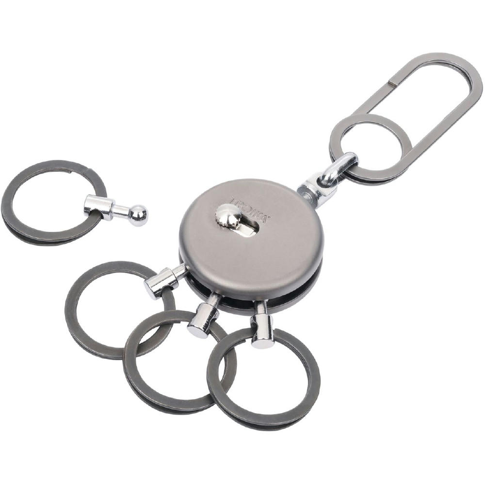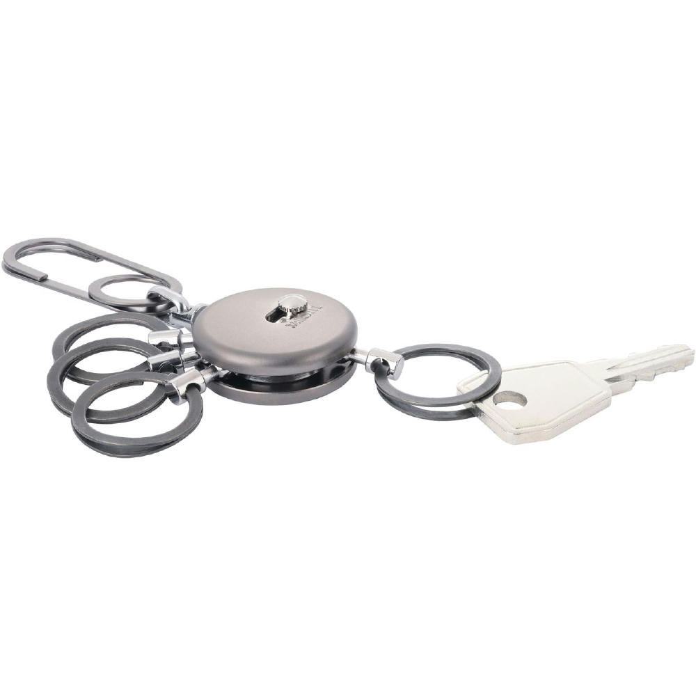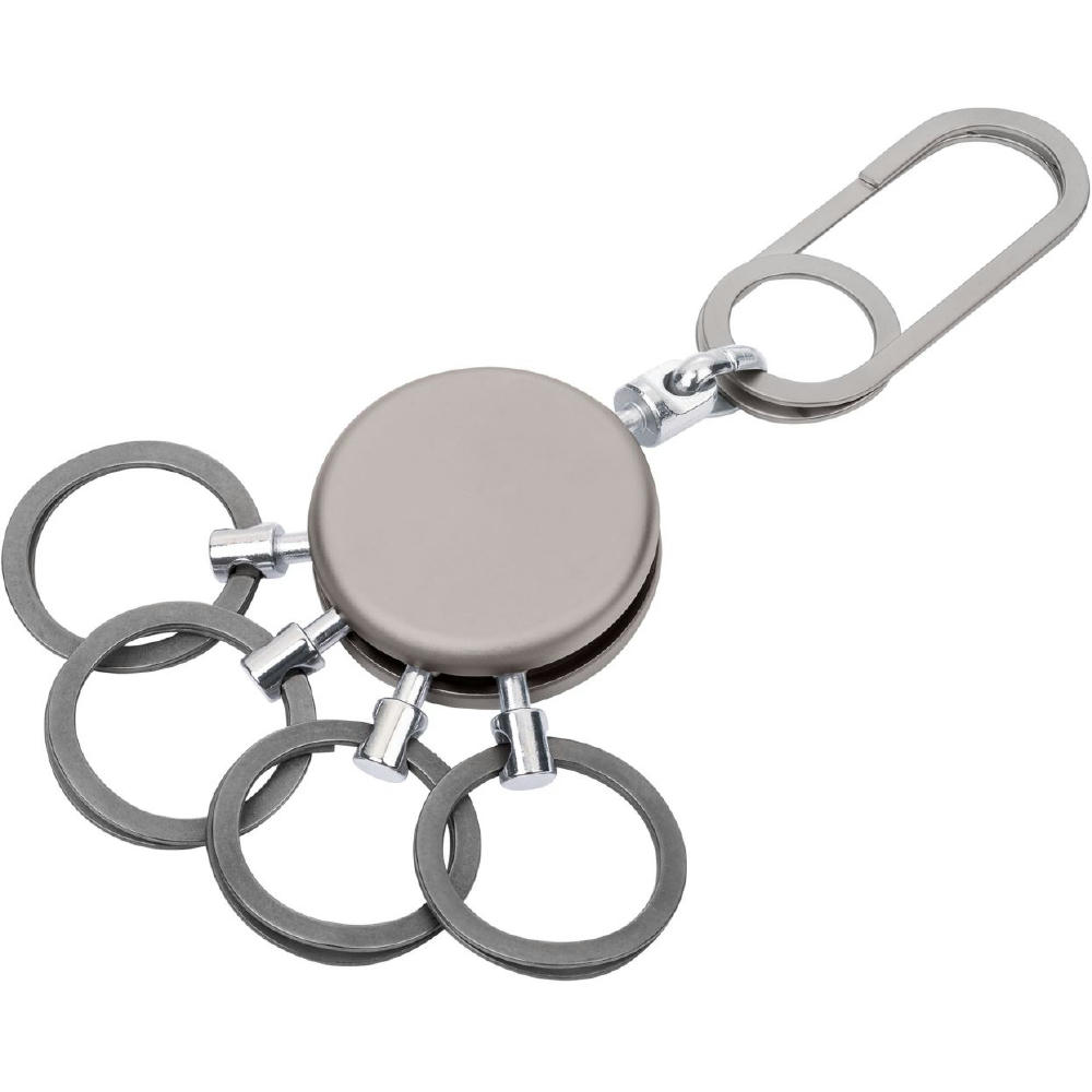 Schlüsselanhänger, rund, inkl. Karabinerhaken, 4 ausklinkbare Ringe, schnelles & einfaches Anbringen der Schlüssel dank patentiertem Öffnungsmechanismus (Nail Guard), Messing, Metall, verchromt, matt, gunmetal.