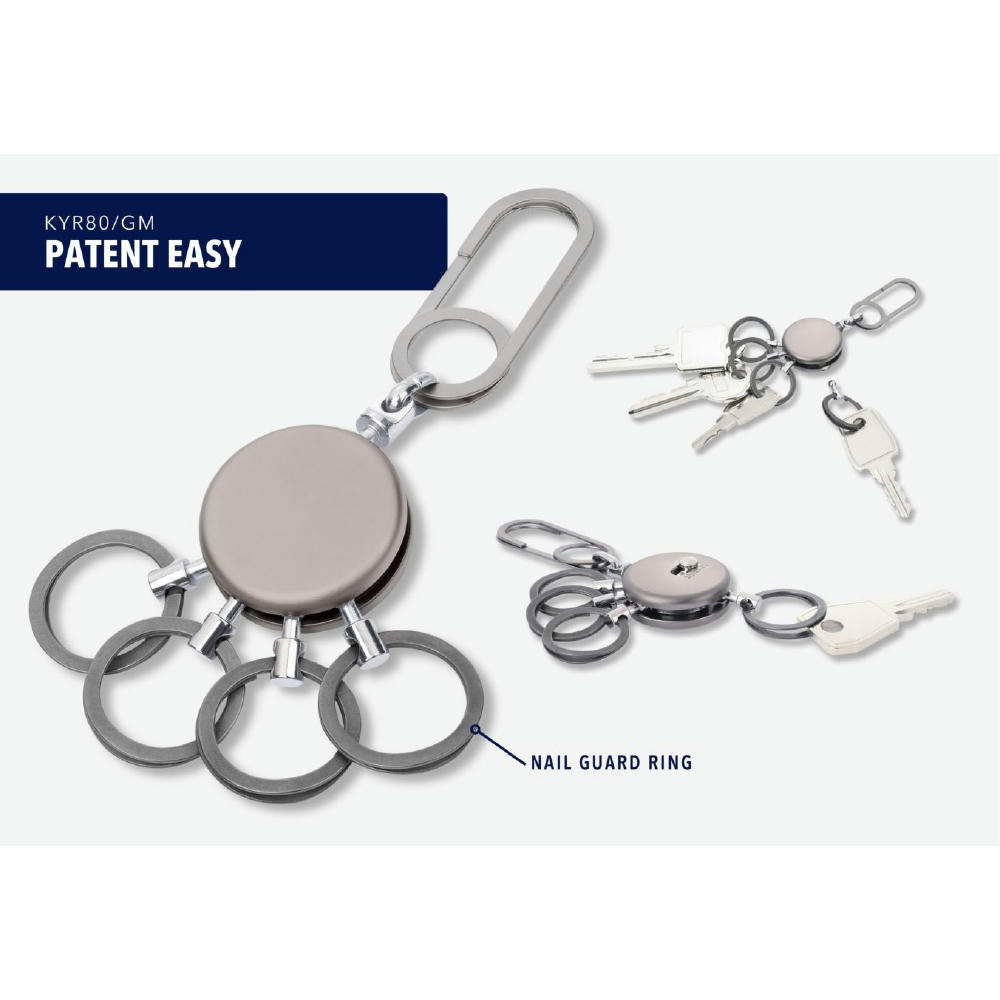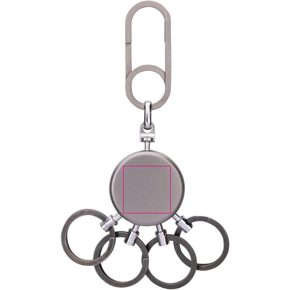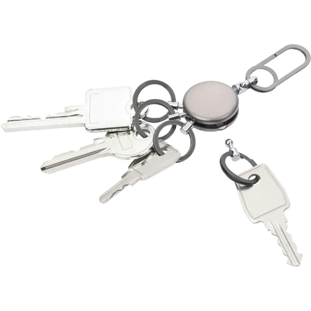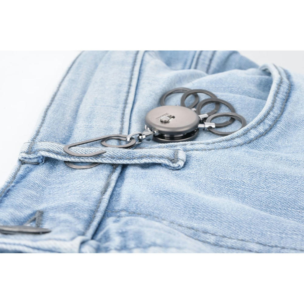 Schlüsselanhänger, rund, inkl. Karabinerhaken, 4 ausklinkbare Ringe, schnelles & einfaches Anbringen der Schlüssel dank patentiertem Öffnungsmechanismus (Nail Guard), Messing, Metall, verchromt, matt, gunmetal.