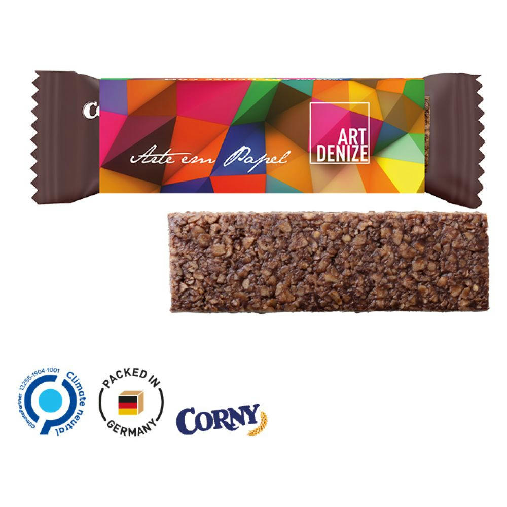 Corny Haferkraft Riegel im Werbeschuber aus weißem Karton, individuell bedruckt. Inhalt: Corny Haferkraft Riegel mit mind. 49% Vollkorn, Sorte Mandel-Karamell, 35 g