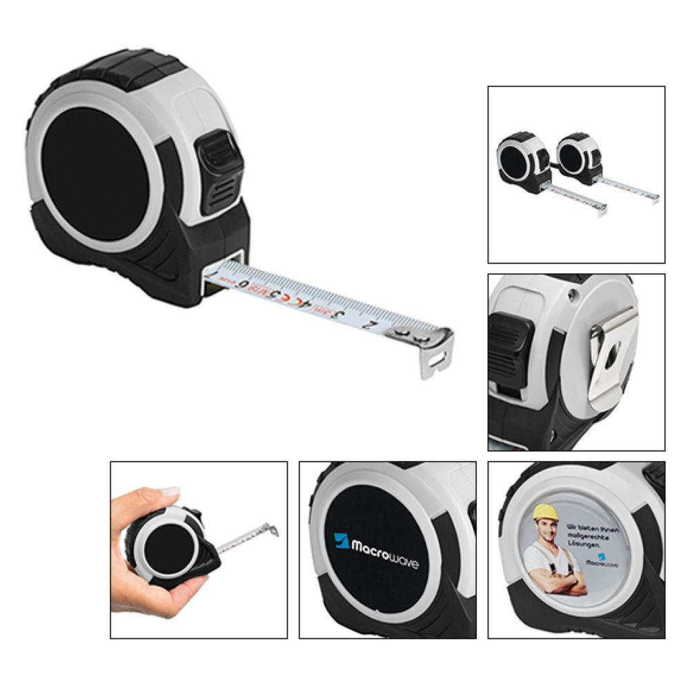 Bandmaß mit Bandfeststellmechanismus, dynamischem Bandrücklauf, beweglichem Bandanfangshaken, Gürtelclip, Gummihandschlaufe. Gehäuse: schlagfestes 2-Komponenten-Gehäuse aus ABS und TPR. Knickfestigkeit: 1,70 m. Skalierung: cm, einseitig.