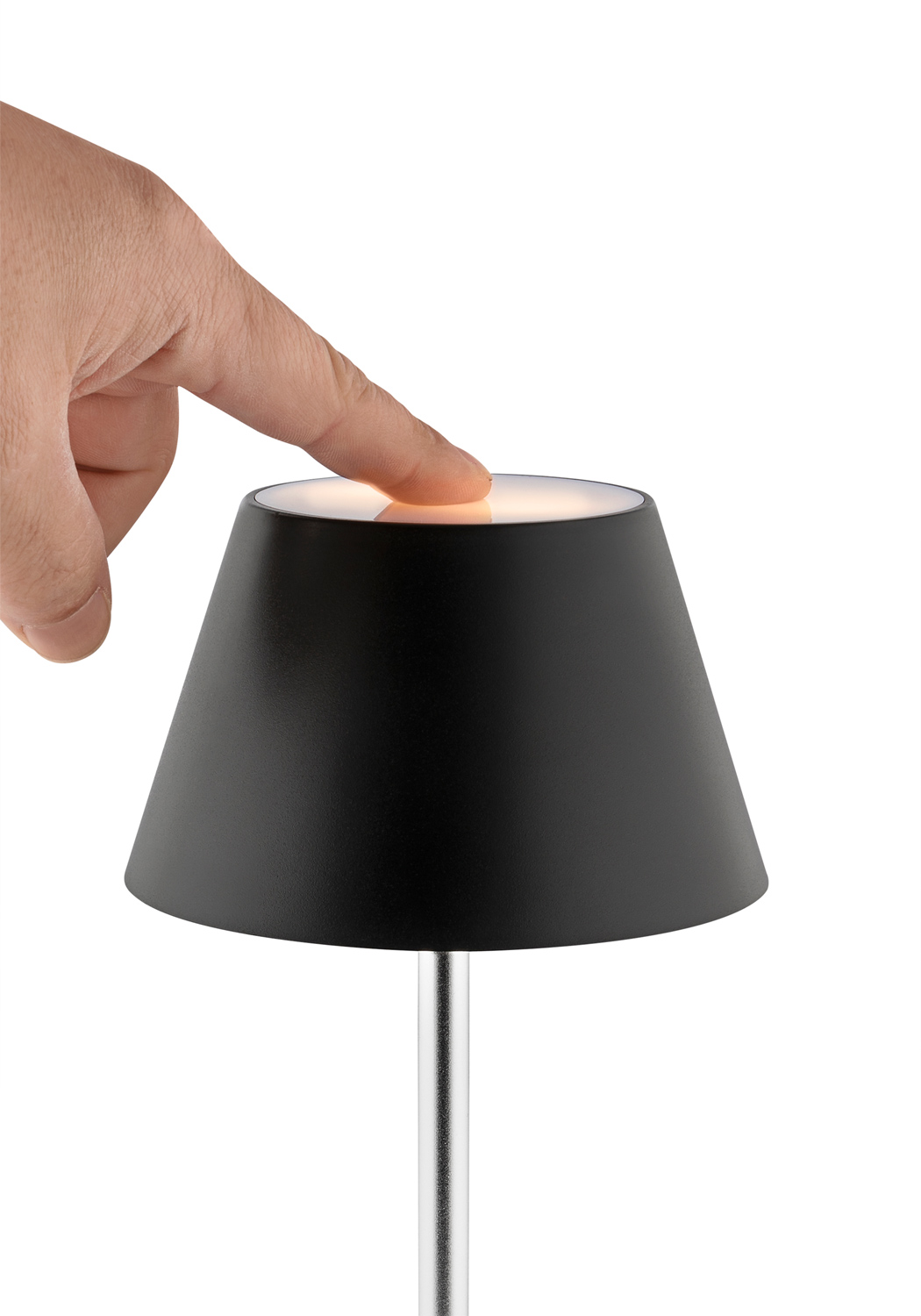 Tischleuchte (dimmbar) kalt-und warmweißes Licht wählbar, mit Akazienholzfuß. Kunststoff und Aluminiumteile recycelt (Recyclinganteil gesamt 40%).1800 mAh Akku (Leuchtdauer ca. 12 Stunden, Wiederaufladedauer 2,5-3 Stunden, 20 Lumen), im Designkarton.