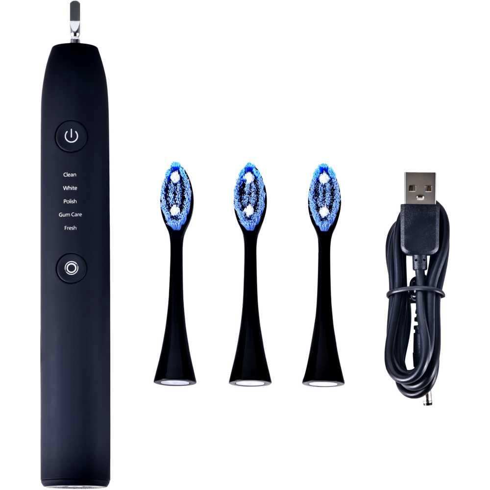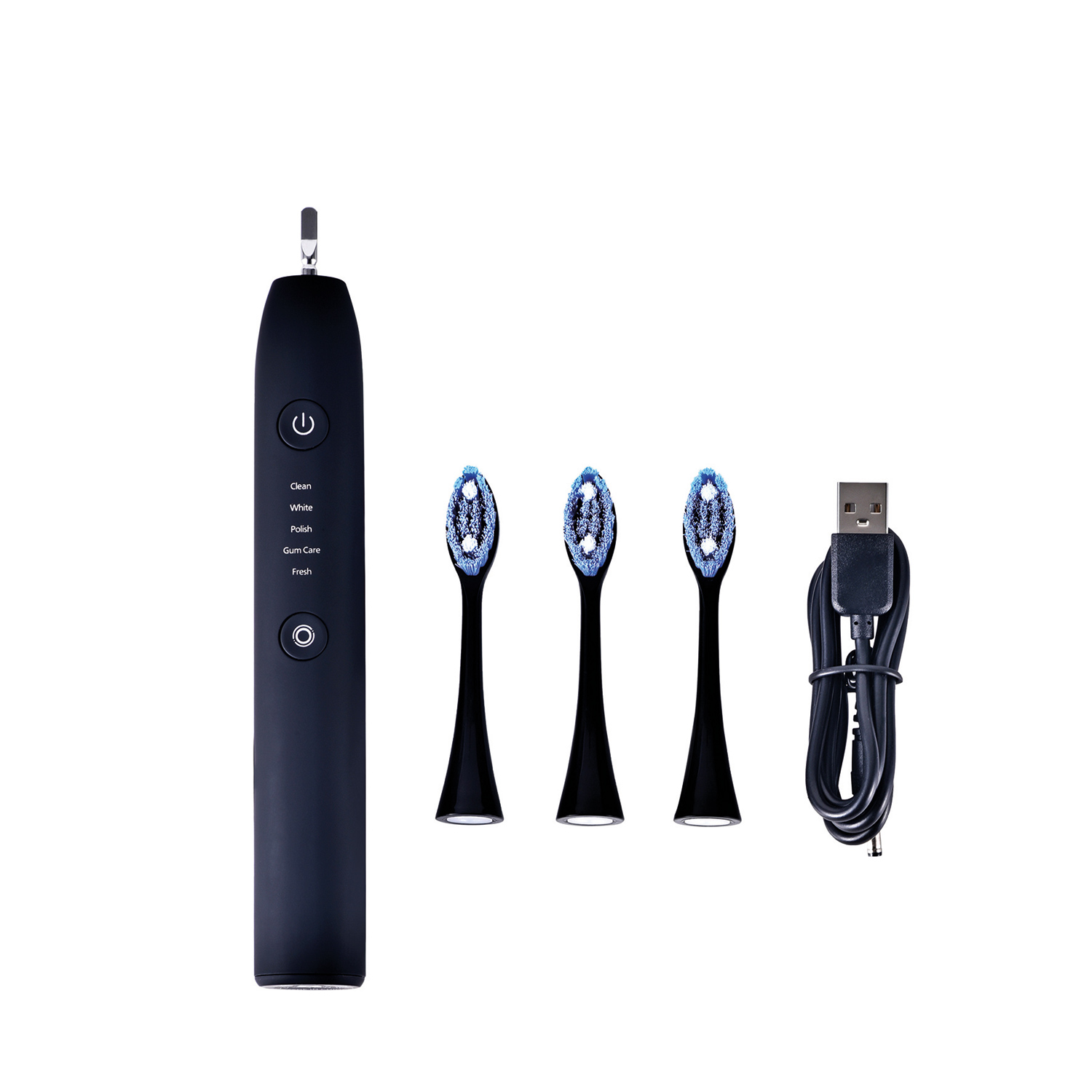 Elektrische Zahnbürste mit 5 verschiedenen Putzmodi & Ladekontrolleuchte. Inkl. USB Ladekabel und 3 Aufsteckbürsten. Nennspannung: 5V. Nennleistung: 2W. Ladezeit: ≈ 8h. Wasserdichtheitsklasse: IPX7. Akku: 1200mAh.