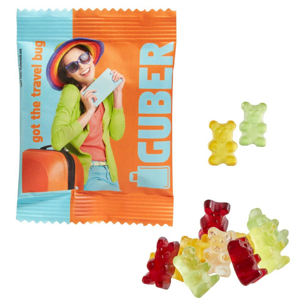 Zuckerfreie Bärchen aus Maltitsirup, Aromen und färbenden Pflanzenauszügen, farblich und geschmacklich bunt gemischt mit Himbeer-, Ananas-, Orangen-, Apfel- und Zitronengeschmack, in glänzend- oder matt-kaschiertem transparentem alternativ weißem Werbetütchen verpackt. Hinweis: Ab 300 kg sind alle Standardformen möglich. Haltbarkeit: ca. 9 Monate bei sachgerechter Lagerung. Inkl. 1-5c-Druck.