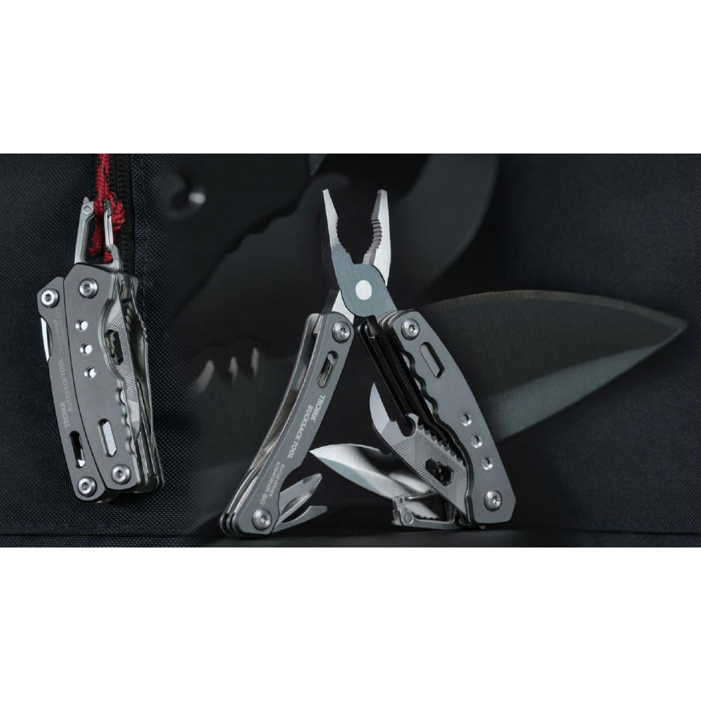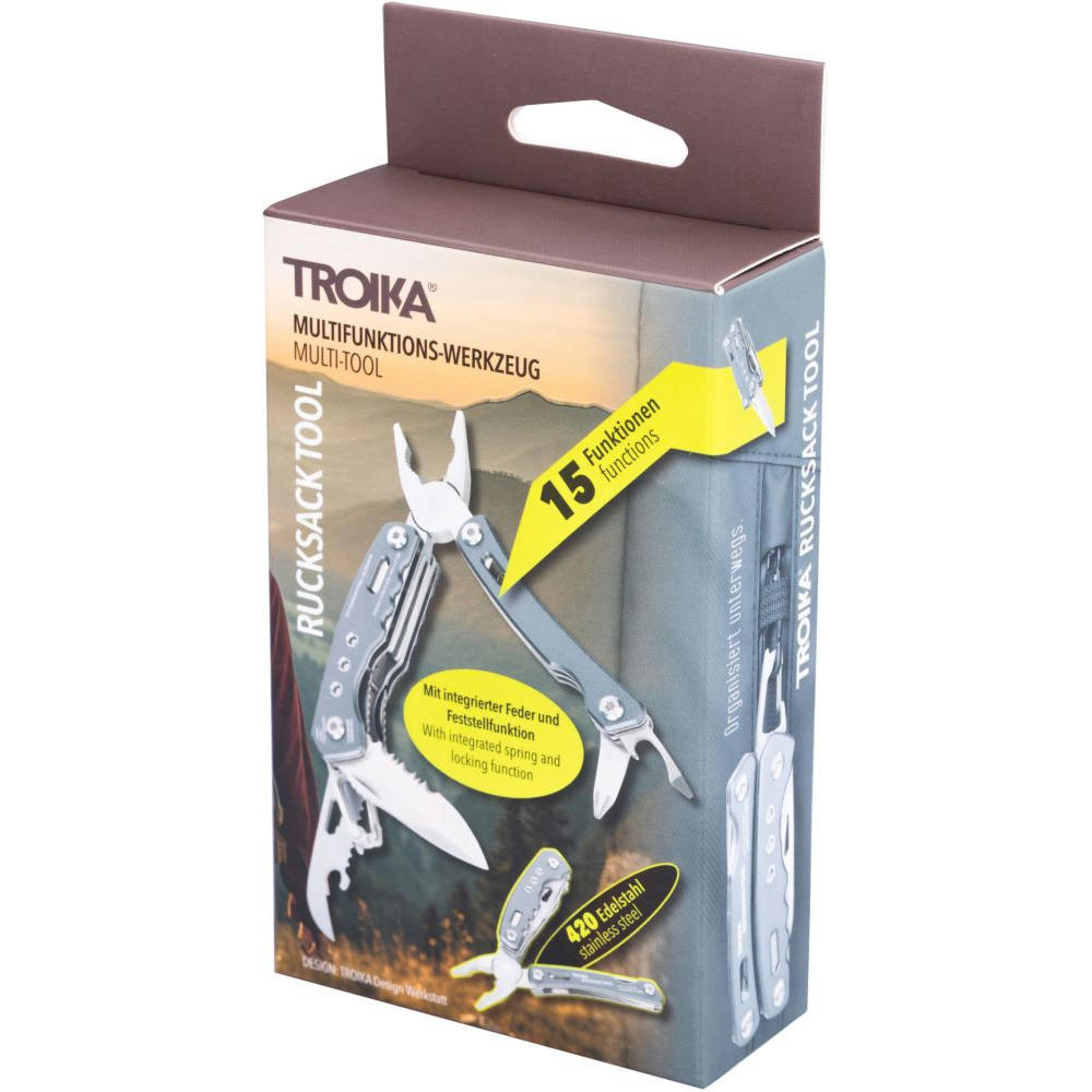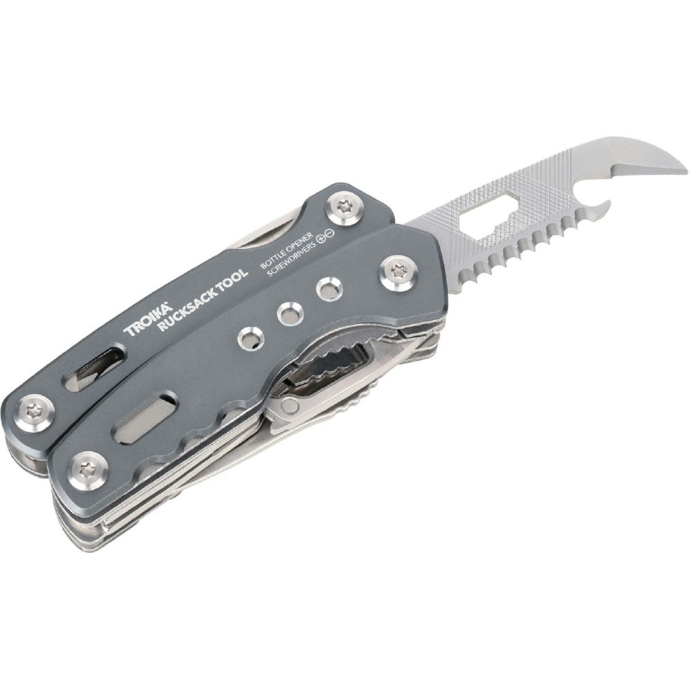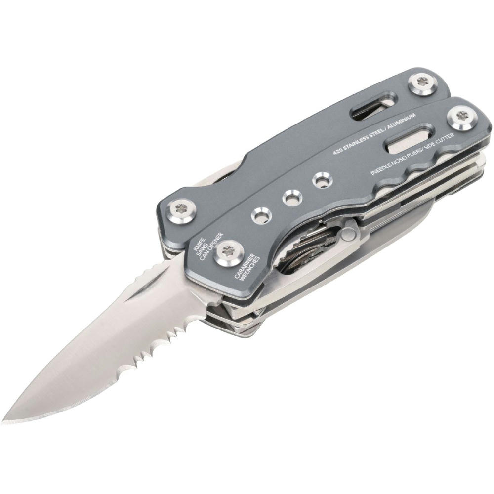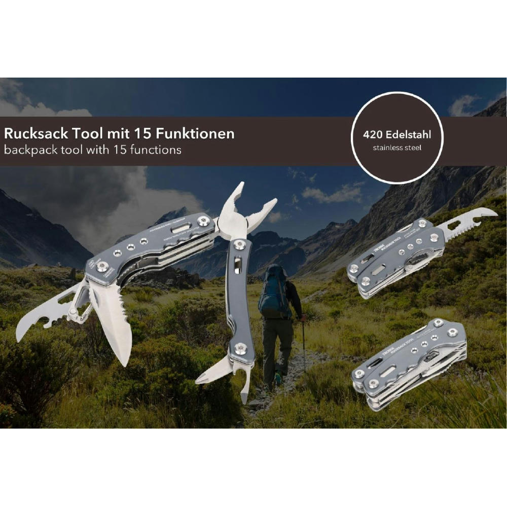 Multifunktions-Werkzeug Rucksack Tool mit 15 Funktionen, integrierte Feder und Feststellfunktion, Spitzzange, Zange, Seitenschneider, Messer, Säge, Schlitzschraubendreher, Dosenöffner, Feile, Karabiner, Flaschenöffner, Sechskant-Schraubenschlüssel, Werkzeuge im eingeklappten Zustand außenliegend, in Nylontasche mit Gürtelschlaufe, 420 Edelstahl, Aluminium, eloxiert, matt.