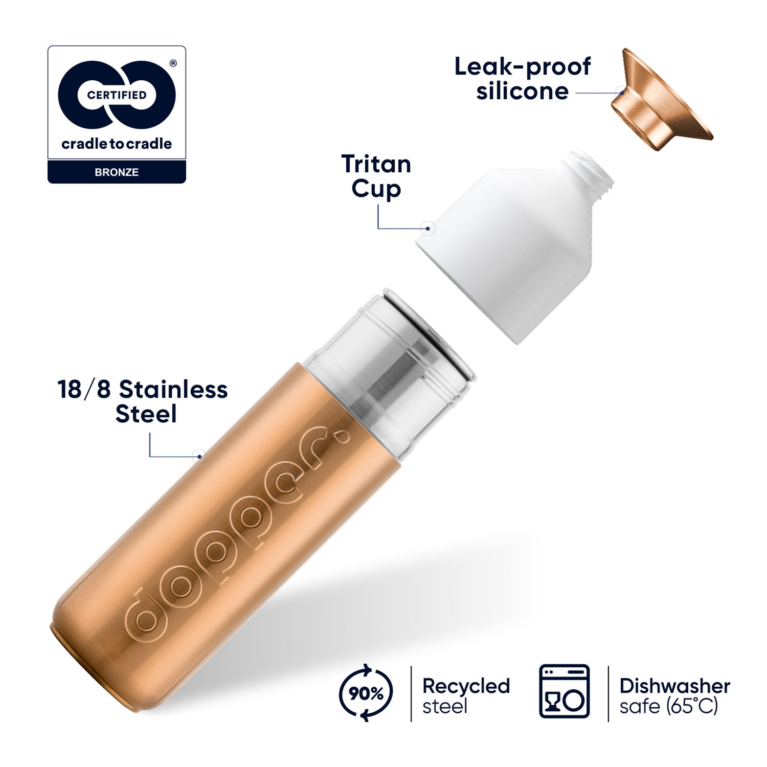 Edelstahl zu 90% recycelt, Silikon und Tritan zu 74% recycelt