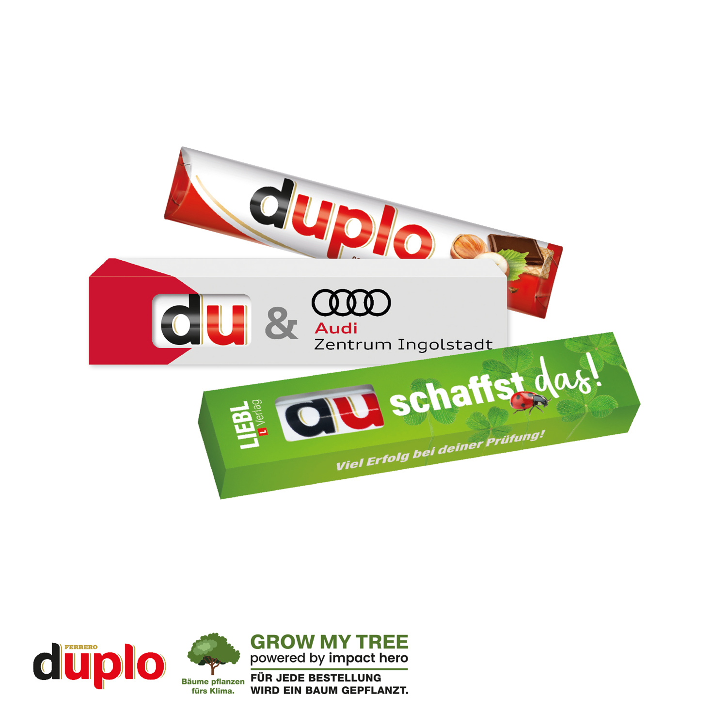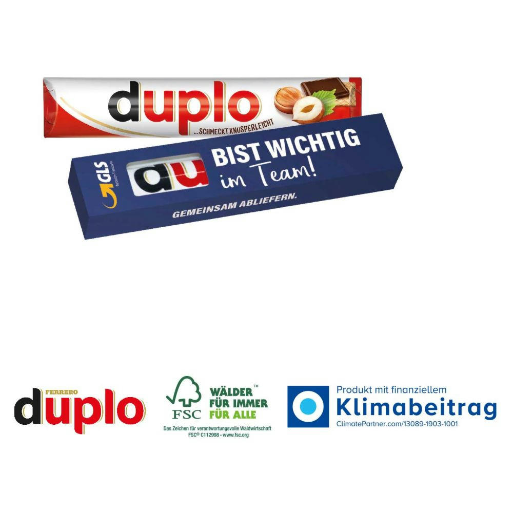 Ein Produkt mit hohem Sympathiewert - Das perfekte Werbemittel. Inhalt: 1 duplo Riegel (ca. 18 g). Geschmacksrichtungen: Schoko oder Weiss. Verpackt in einer individuellen Werbekartonage. Inkl. 4c-Druck. Für jede Bestellung wird ein Baum über GROW MY TREE gepflanzt.
