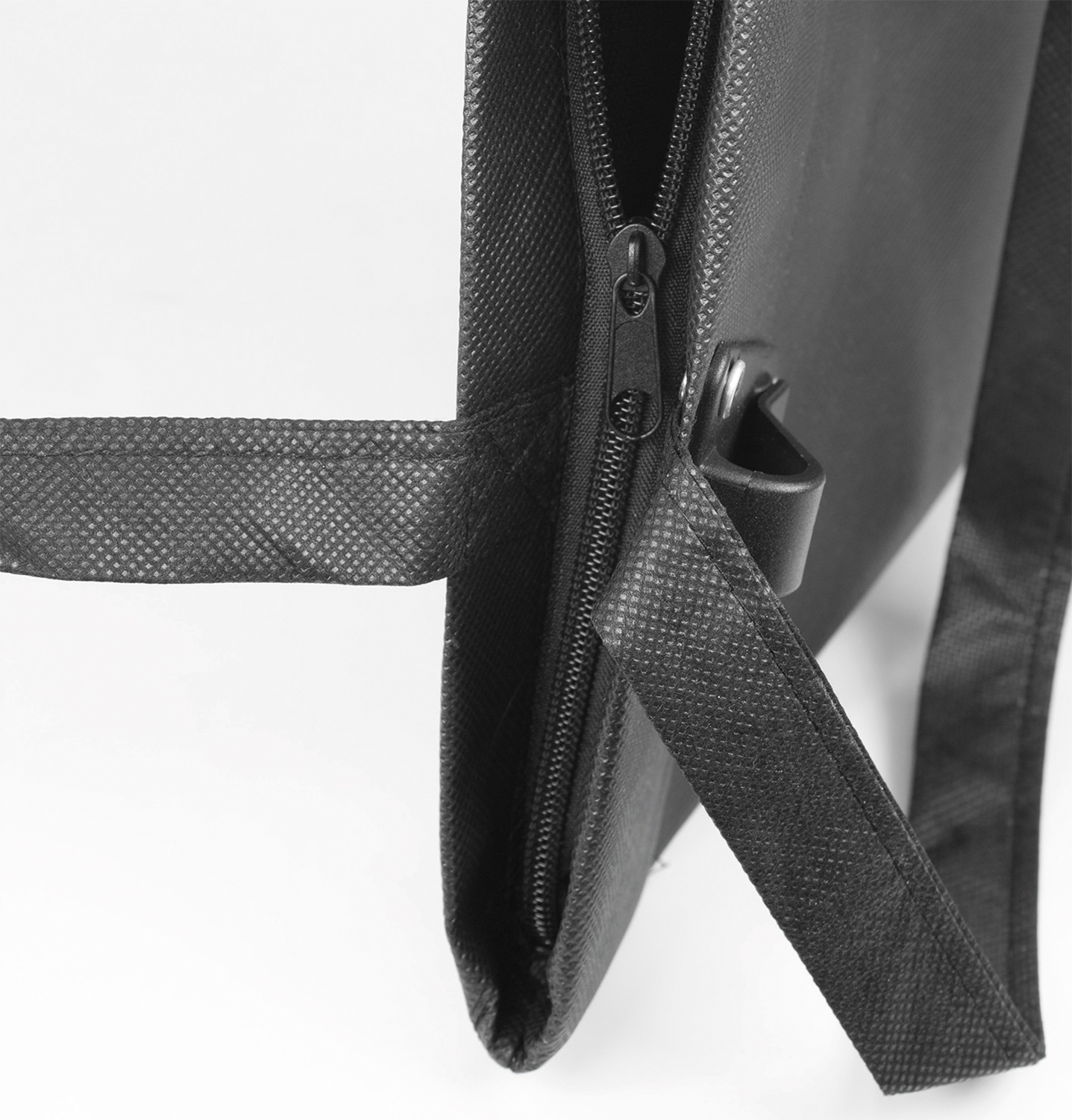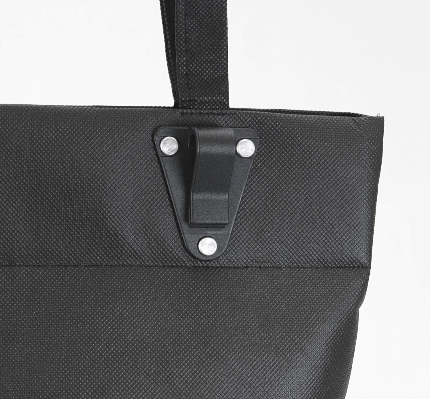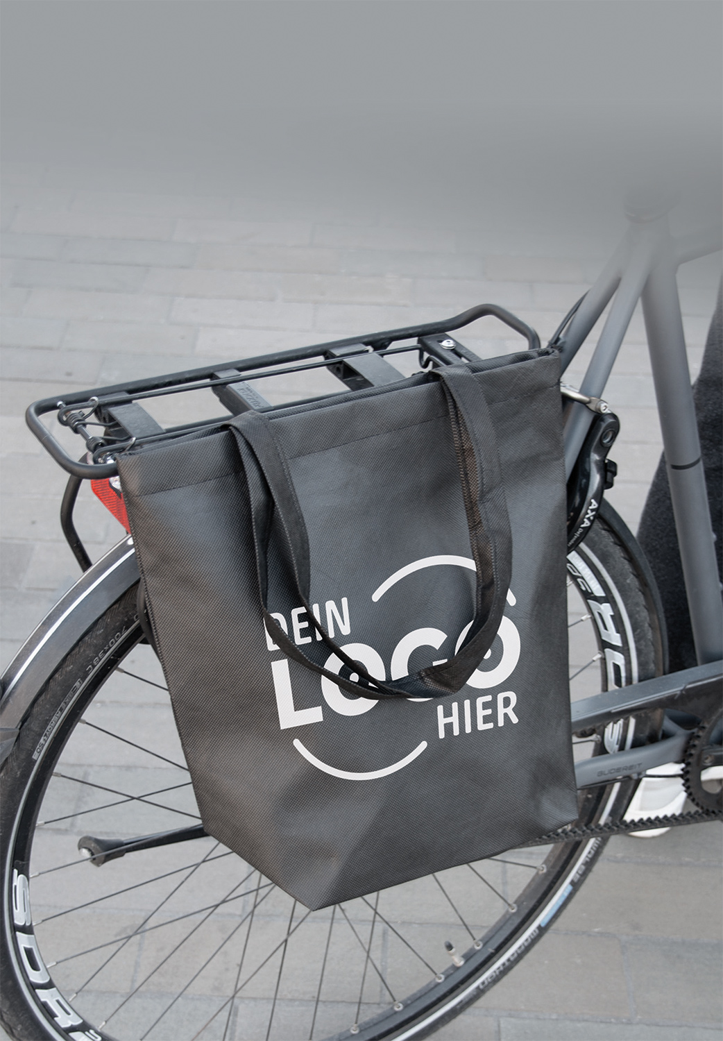 Faltbare Fahrradtasche mit Bodenfalte, Reißverschluss und im Kreuzstich vernähten Henkeln. Hergestellt aus recycelten PET-Flaschen.