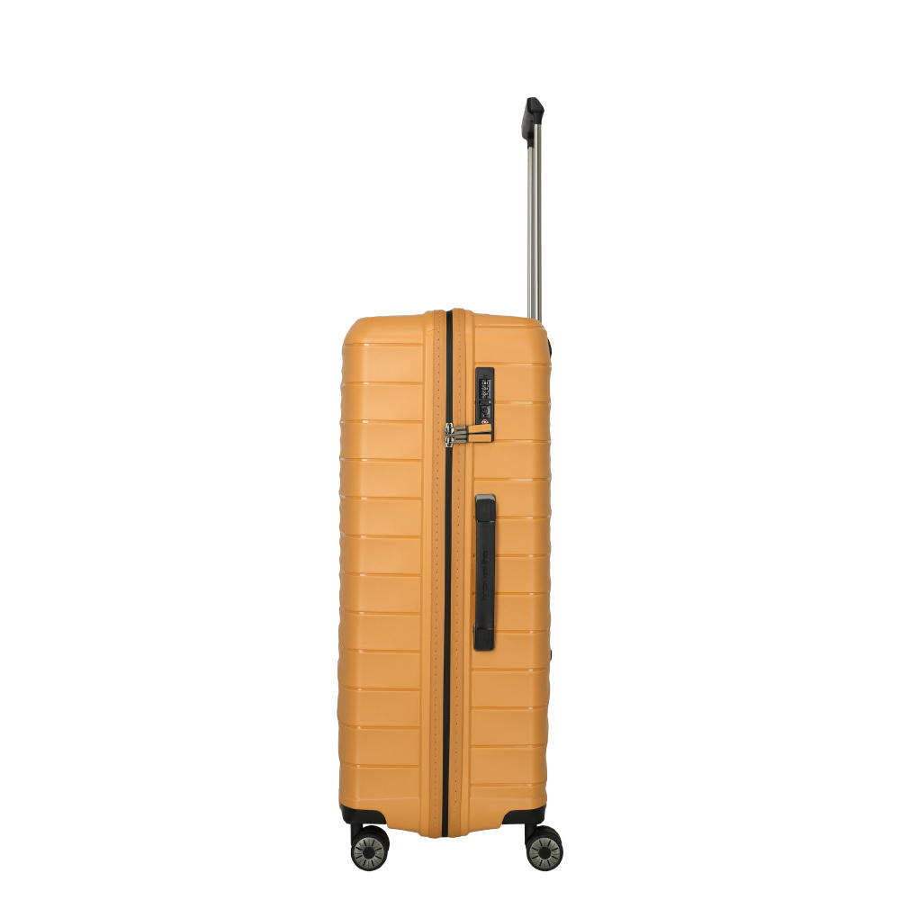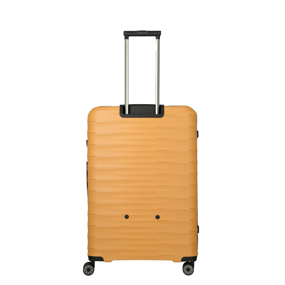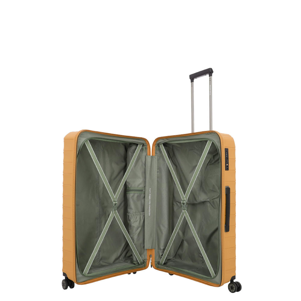 Eine gute Größe. Für alles, was deine Familie braucht. Mit dem großen Trolley der Produktserie Mooby kann man sich ganz entspannt auch auf längere Reisen begeben: Der Innenraum ist überaus großzügig dimensioniert und gibt mit seinen Packgurten und einer Packwand mit Reißverschluss-Fach der Garderobe zuverlässigen Halt. Der Trolley ist bemerkenswert elastisch, leicht und stark zugleich, das Außenmaterial ist aus recyceltem, kratzfestem Polypropylen. Vier leichtgängige, laufruhige Doppelrollen garantieren eine perfekte Mobilität – wo immer dich deine Reise hinführt.